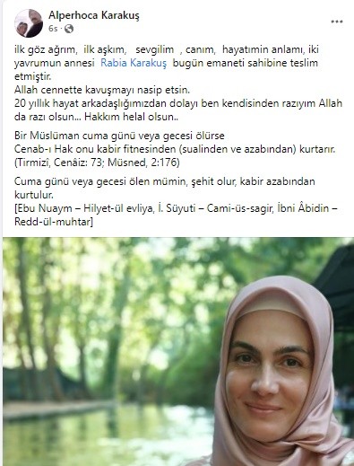 “ilk göz ağrım, ilk aşkım, sevgilim, canım, hayatımın anlamı, iki yavrumun annesi Rabia Karakuş bugün emaneti sahibine teslim etmiştir. Allah cennette kavuşmayı nasip etsin. 20 yıllık hayat arkadaşlığımızdan dolayı ben kendisinden razıyım Allah da razı olsun… Hakkım helal olsun…”