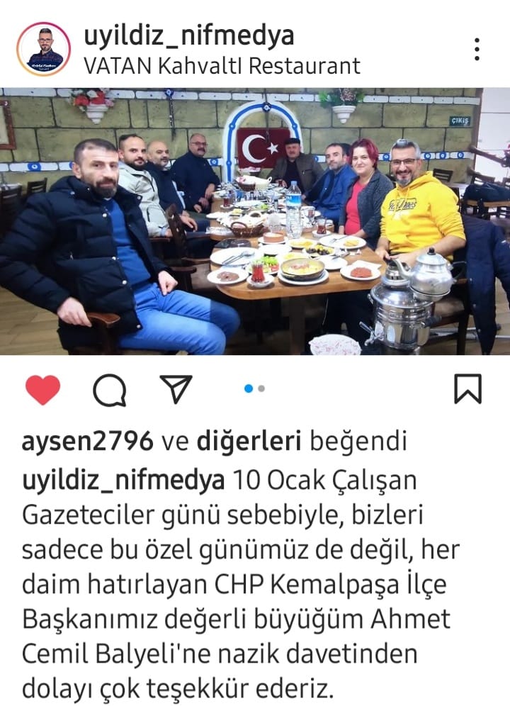 Kemalpaşa’ da bir siyasi parti başkanı Urla’daki gibi duyarsız kalmadı. İlçede görev yapan gazetecileri bu anlamlı günlerinde unutmadı, birlik ve beraberliklerini verdiği dostluk yemeğiyle pekiştirdi. Biz bunuda beklemiyoruz ,bir mesaj ve bir alo demeniz yeterdi.